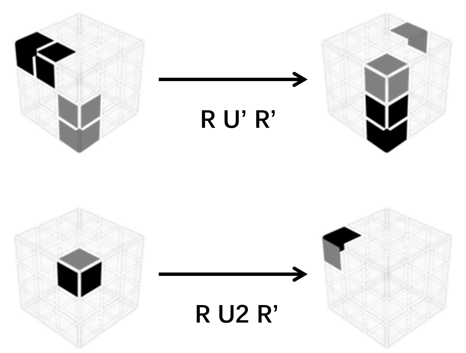 在完成右桥时,两类基本操作R Ux R'与R' Ux R会非常有用:它们涉及与右桥空缺棱角对的位置有关的块的操作。可以将空缺棱角对的位置中的块移出,或是将位于顶层的棱角对放在空缺棱角对的位置中,完成归位。